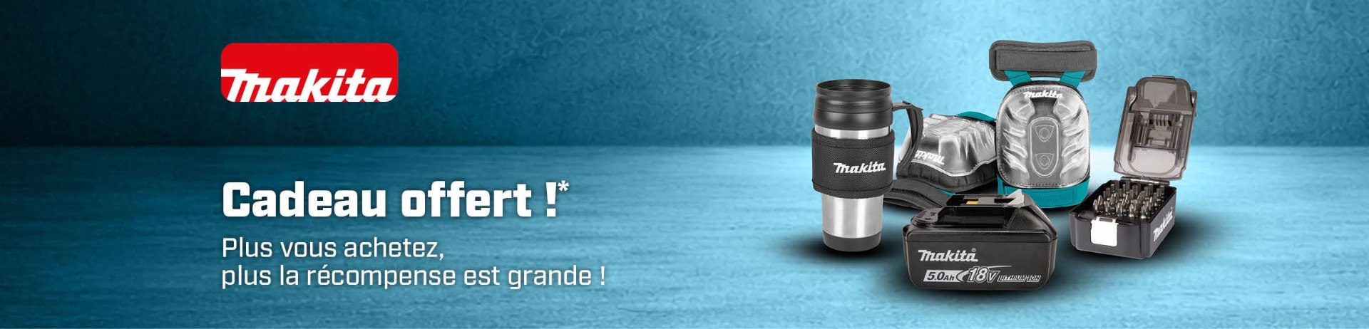 *Plus le montant de votre achat est élevé, plus le cadeau est important. Cette offre est valable sur toute la gamme Makita, y compris les machines (à batterie), les outils de jardin, les systèmes de rangement et les accessoires. En bref, tout Makita est concerné ! Combinez vos produits Makita préférés et recevez un cadeau. Ne manquez pas cette opportunité unique !