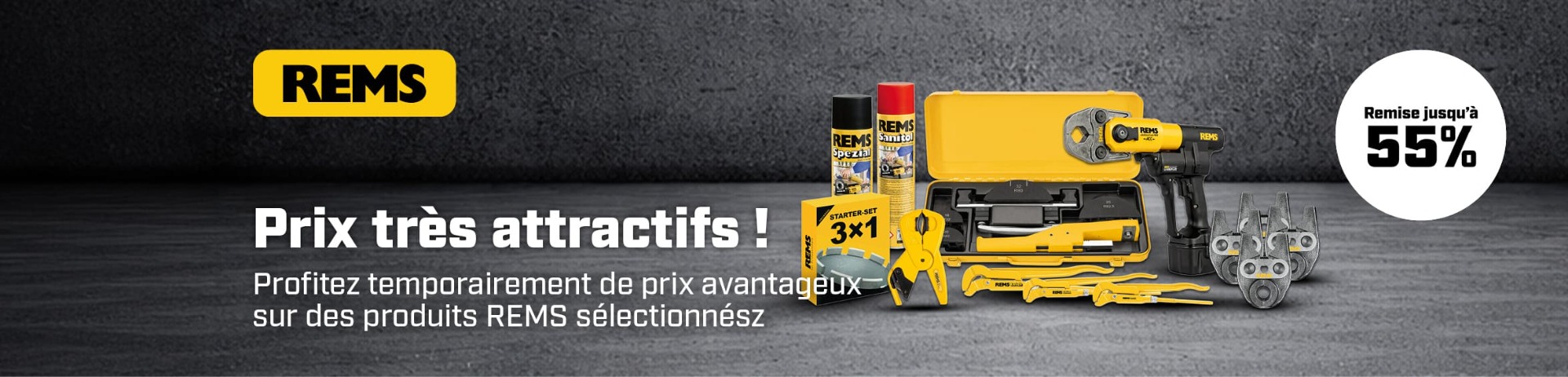 Travaillez avec précision et fiabilité grâce à REMS. Des machines de sertissage puissantes aux coupe-tubes fiables, conçus pour les professionnels qui ne font aucun compromis. Profitez dès maintenant de réductions allant jusqu’à 55 % et équipez-vous de qualité supérieure à un prix attractif.